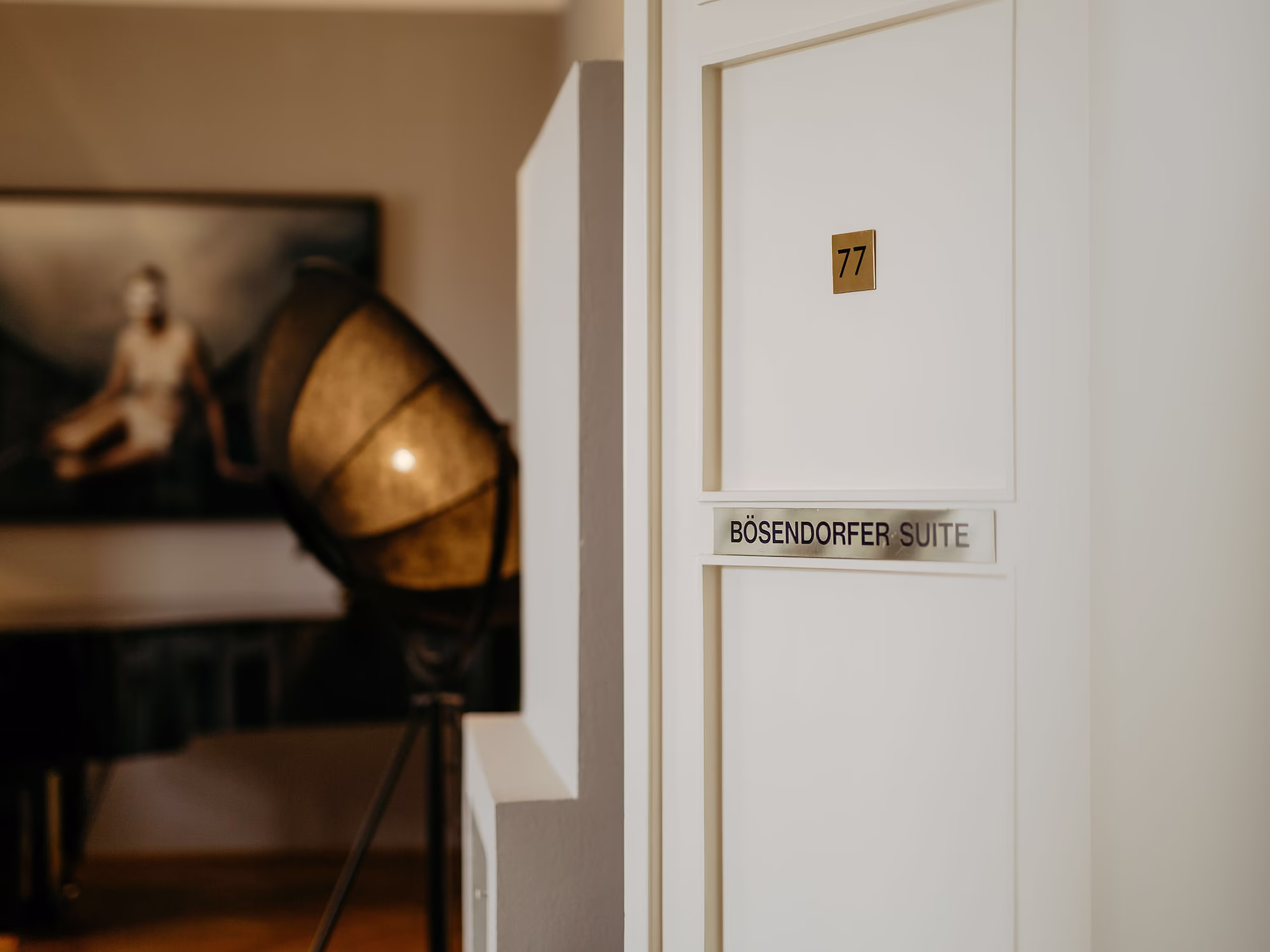 Named after the grand piano of the same name which finds its place in the suite. The Viennese piano manufacturer Bösendorfer was founded in 1828 and has been significantly involved in the development of 19th and 20th century piano music from the very beginning. Starting with the piano virtuoso Franz Liszt, Bösendorfer can look back on a long and prominent list of customers. In other respects, too, the spacious suite impresses with its timeless design, a handpicked selection of art objects and, for example, a tiled stove from the previous century. A photograph by Annie Leibovitz hangs opposite a painting by artist Robin Christian Andersen (b. 1890 † 1969). In the bedroom is the famous "Zettel'z" lamp by Ingo Maurer and a work by Viennese artist Alexander Ruthner (b. 1982). The latter also dressed the hotel's entrance with his signature grass paintings.