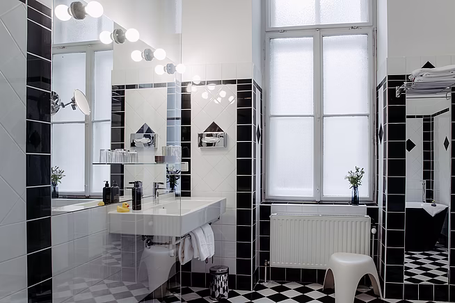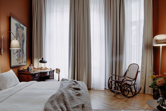 Die Suite kombiniert klassische Elemente wie hohe Decken und traditionelles Wiener Mobiliar mit modernen Akzenten. Eine freistehende Badewanne im Badezimmer, elegante Garderobenmöbel und ein Vintage-Drehstuhl aus den 1940er Jahren sind nur einige Beispiele für die gut durchdachte Mischung aus Alt und Neu, die den Räumen eine lebendige und einladende Atmosphäre verleiht.