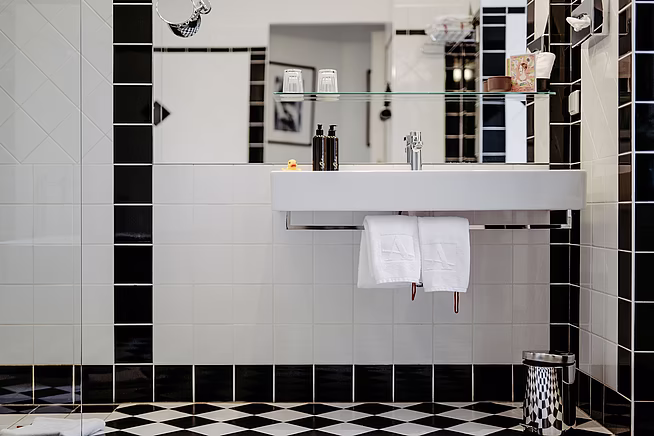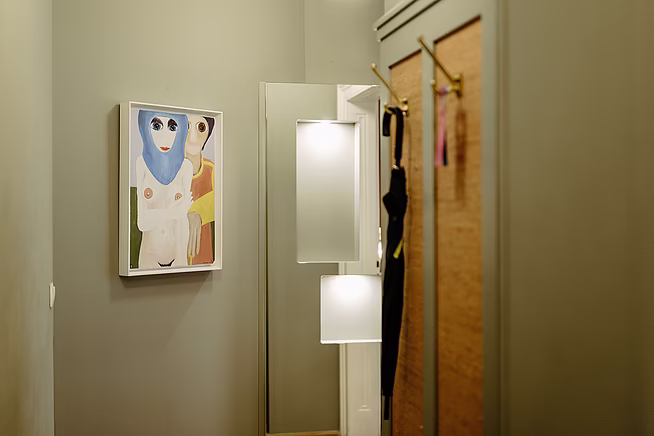 Eine der auffälligsten Designentscheidungen war die Verwendung von Bast an der Rückwand des Kleiderschranks, inspiriert von den grünen Tapeten und Messinghaken im Sigmund Freud Museum. Diese Wahl spiegelt die ursprünglichen Elemente des Kleiderschranks in Freuds Büro wider und fügt dem schmalen Flur der Suite eine subtile historische Note hinzu. Dies wird durch eine Spiegelwand und ein eklektisches Gemälde von Robert Zeppel-Sperl ergänzt.